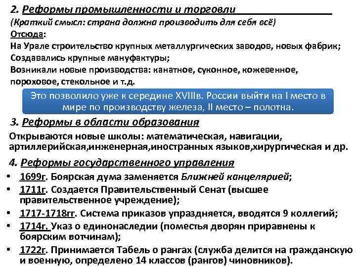 2. Реформы промышленности и торговли (Краткий смысл: страна должна производить для себя всё) Отсюда: На Урале строительство крупных металлургических заводов, новых фабрик; Создавались крупные мануфактуры; Возникали новые производства: канатное, суконное, кожевенное, пороховое, стекольное и т. д. Это позволило уже к середине XVIIIв. России выйти на I место в мире по производству железа, II место – полотна. 3. Реформы в области образования Открываются новые школы: математическая, навигации, артиллерийская, инженерная, иностранных языков, хирургическая и др. 4. Реформы государственного управления • 1699 г. Боярская дума заменяется Ближней канцелярией; • 1711 г. Создается Правительственный Сенат (высшее правительственное учреждение); • 1717 -1718 гг. Система приказов упраздняется, вводятся 9 коллегий; • 1714 г. Указ о единонаследии (поместья дворян приравнены к боярским вотчинам); • 1722 г. Принимается Табель о рангах (служба делится на гражданскую и военную, определено 14 классов (рангов) чиновников).