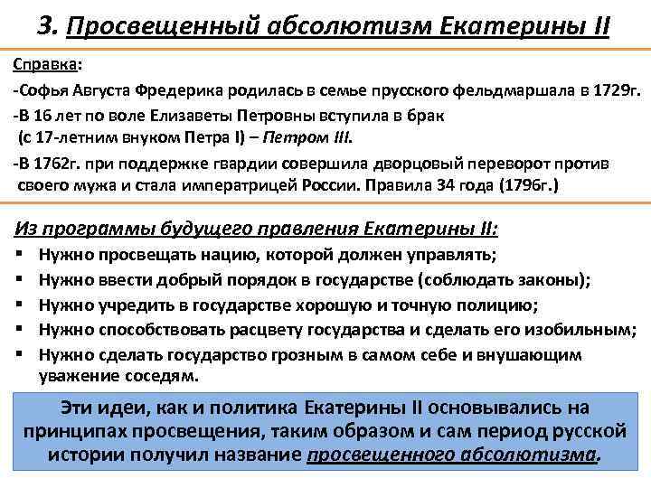 3. Просвещенный абсолютизм Екатерины II Справка: -Софья Августа Фредерика родилась в семье прусского фельдмаршала в 1729 г. -В 16 лет по воле Елизаветы Петровны вступила в брак (с 17 -летним внуком Петра I) – Петром III. -В 1762 г. при поддержке гвардии совершила дворцовый переворот против своего мужа и стала императрицей России. Правила 34 года (1796 г. ) Из программы будущего правления Екатерины II: § § § Нужно просвещать нацию, которой должен управлять; Нужно ввести добрый порядок в государстве (соблюдать законы); Нужно учредить в государстве хорошую и точную полицию; Нужно способствовать расцвету государства и сделать его изобильным; Нужно сделать государство грозным в самом себе и внушающим уважение соседям. Эти идеи, как и политика Екатерины II основывались на принципах просвещения, таким образом и сам период русской истории получил название просвещенного абсолютизма.
