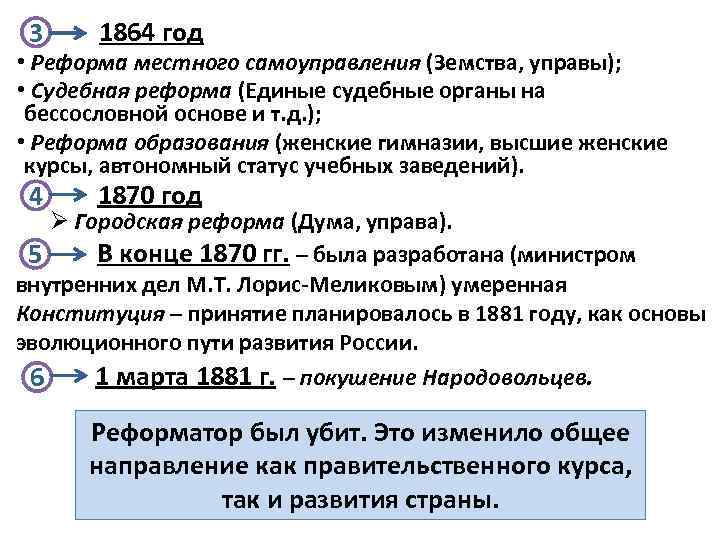 3 1864 год 4 1870 год • Реформа местного самоуправления (Земства, управы); • Судебная реформа (Единые судебные органы на бессословной основе и т. д. ); • Реформа образования (женские гимназии, высшие женские курсы, автономный статус учебных заведений). Ø Городская реформа (Дума, управа). В конце 1870 гг. – была разработана (министром 5 внутренних дел М. Т. Лорис-Меликовым) умеренная Конституция – принятие планировалось в 1881 году, как основы эволюционного пути развития России. 1 марта 1881 г. – покушение Народовольцев. 6 Реформатор был убит. Это изменило общее направление как правительственного курса, так и развития страны.