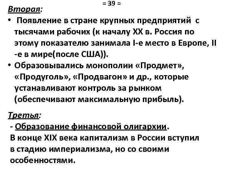 = 39 = Вторая: • Появление в стране крупных предприятий с тысячами рабочих (к началу XX в. Россия по этому показателю занимала I-е место в Европе, II -е в мире(после США)). • Образовывались монополии «Продмет» , «Продуголь» , «Продвагон» и др. , которые устанавливают контроль за рынком (обеспечивают максимальную прибыль). Третья: - Образование финансовой олигархии. В конце XIX века капитализм в России вступил в стадию империализма, но со своими особенностями.