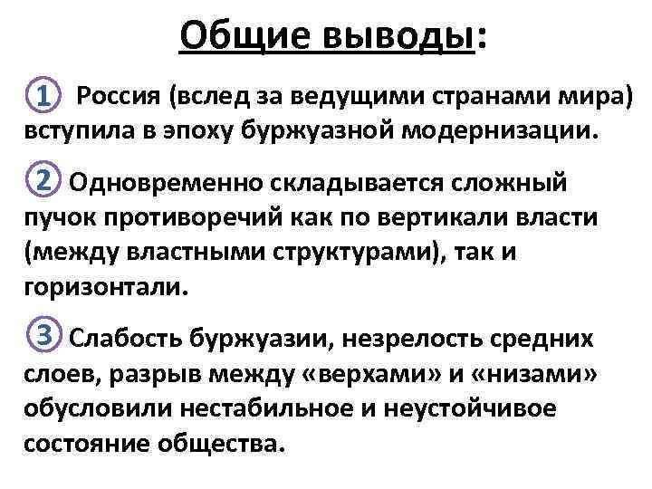 Общие выводы: 1 Россия (вслед за ведущими странами мира) вступила в эпоху буржуазной модернизации. 2 Одновременно складывается сложный пучок противоречий как по вертикали власти (между властными структурами), так и горизонтали. 3 Слабость буржуазии, незрелость средних слоев, разрыв между «верхами» и «низами» обусловили нестабильное и неустойчивое состояние общества.