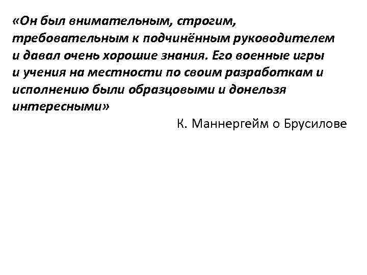 «Он был внимательным, строгим, требовательным к подчинённым руководителем и давал очень хорошие знания. Его военные игры и учения на местности по своим разработкам и исполнению были образцовыми и донельзя интересными» К. Маннергейм о Брусилове