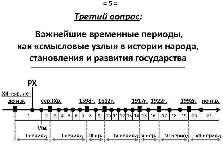 =5= Третий вопрос: Важнейшие временные периоды, как «смысловые узлы» в истории народа, становления и развития государства РХ XII тыс. лет до н. э. 1 сер. IXв. 2 1598 г. 1612 г. 3 4 5 6 7 8 9 1917 г. 1922 г. 10 11 12 13 14 15 16 1992 г. по н. в. 17 18 19 20 21 VIв. I период III пр. IV период V пер. VI период VII период