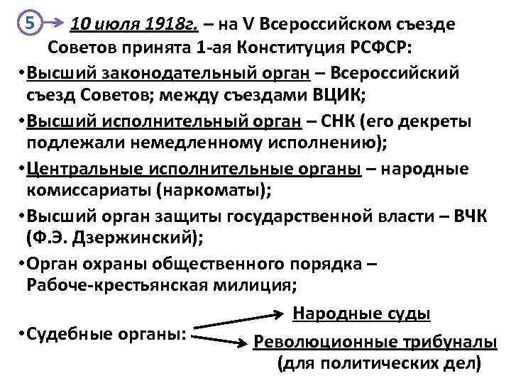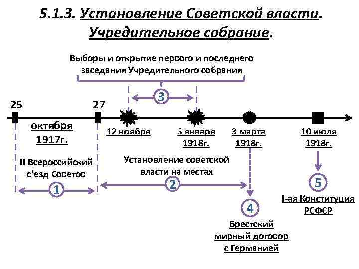 5. 1. 3. Установление Советской власти. Учредительное собрание. Выборы и открытие первого и последнего заседания Учредительного собрания 25 3 27 октября 1917 г. II Всероссийский с’езд Советов 1 12 ноября 5 января 1918 г. 3 марта 1918 г. 10 июля 1918 г. Установление советской власти на местах 5 2 4 I-ая Конституция РСФСР Брестский мирный договор с Германией