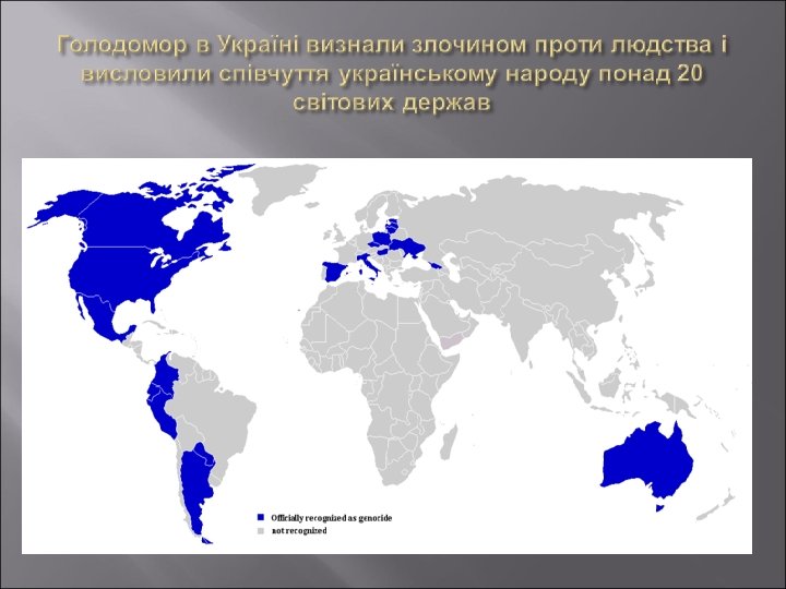 У 1988 році Конгрес США, а у 1989 р. Міжнародна комісія юристів офіційно визнали голодомор 1932 33 рр. актом геноциду проти української нації. 15 травня 2003 р. Верховна Рада України в офіційному зверненні до народу України визнала голодомор 1932 33 рр. актом геноциду. (Але не прийняла постанови, поданої на її розгляд, що до цього питання, обмежившись лише офіційним зверненням, що майже не має юридичної цінності. ) На вересень 2003 р. офіційні документи з приводу голодомору ухвалили у Бельгії, США, Канаді, Аргентині і Країні Басків (Іспанія). Міжнародна конференція з нагоди 70 ї річниці Голодомору, організована Інститутом досліджень історії суспільства та релігії міста Віченца (Італія) 16— 18 жовтня 2003 року. За результатами роботи опубліковано книгу «Смерть землі. Великий голод в Україні 1932— 1933 років» (вийшла італійською мовою). у листопаді 2003 року угорський парламент одноголосно прийняв постанову, яка визнає голодомор 1932— 1933 років актом геноциду проти українського народу Проблема визнання голодомору 1932 33 рр. в Україні злочином проти людства розглядалася на 58 й сесії Генеральної Асамблеї ООН — з нагоди 70 х роковин подій (10 листопада 2003 р. ). В кінці листопада 2003 р. в Парижі проведено дні пам'яті жертв голодомору в Україні. Почесний президент — Ален Безансон. 28 листопада 2006 року Верховна Рада України ухвалила закон «Про Голодомор 1932— 1933 років в Україні» , який трактує події 1932— 1933 років, як Геноцид українського народу. Рішення було ухвалене 233 голосами. Від Партії регіонів проголосувало 2 депутати, від БЮТ — 118, від «Нашої України» — 79, від Соцпартії — 30, позафракційних — 4. Фракція комуністів за законопроект, поданий Президентом України, не голосувала у повному складі. 3 липня 2008 Парламентська Асамблея Організації з безпеки й співробітництва в Європі (ПА ОБСЄ) прийняла резолюцію щодо Голодомору в Україні. Резолюція "рішуче пропонує всім парламентаріям вжити заходів для визнання факту Голодомору в Україні"