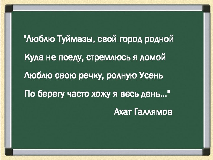 "Люблю Туймазы, свой город родной Куда не поеду, стремлюсь я домой Люблю свою речку, родную Усень По берегу часто хожу я весь день. . . " Ахат Галлямов