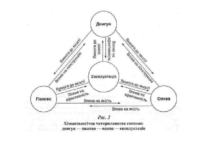 У хіммотології двигун, а також його нерозлучні супутники – паливо й олива – розглядаються як складові частини чотириланкової системи (див. рис. 3), що відображає якісний взаємозв'язок між її ланками. Насправді ефективність роботи двигуна залежить не тільки від його конструктивних і технологічних особливостей, а й значною мірою і від того, наскільки вдало для нього підібрано паливо й оливу, наскільки повно за якістю вони відповідають вимогам, які до них ставляться.