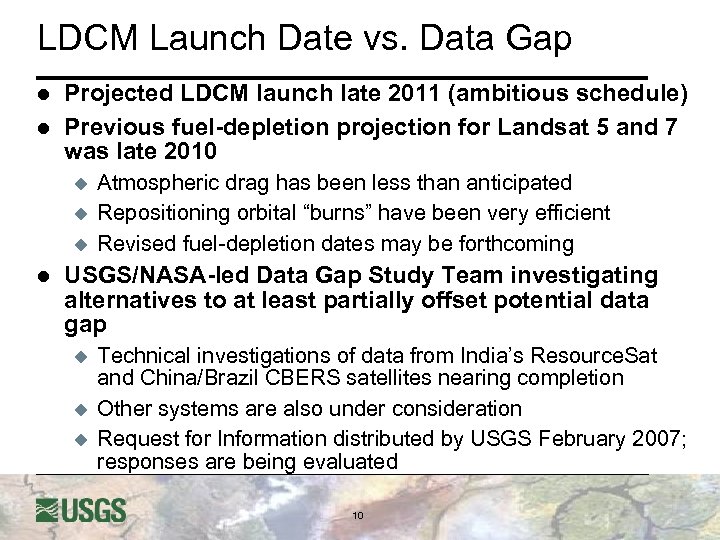 Data Gap Study Team Management l l l Landsat Data Gap Study Team (LDGST) u Developing a strategy for providing data to National Satellite Land Remote Sensing Data Archive for 1 -4 years LDGST Technical and Policy groups u Developing & analyzing a set of technical & operational scenarios for receiving, ingesting, archiving, and distributing data from alternative, Landsat-like satellite systems. u Conduct trade studies & assess the risk of the various scenarios & provide rough order magnitude costs for the alternatives u Develop Data Gap program recommendation to OSTP u USGS to develop operational program for Data Gap and LDCM Data Characterization Working Group (DCWG) u Technical group from three field centers (USGS EROS, NASA GSFC, NASA SSC) to evaluated data from IRS-P 6 and CBERS -2 sensors 9