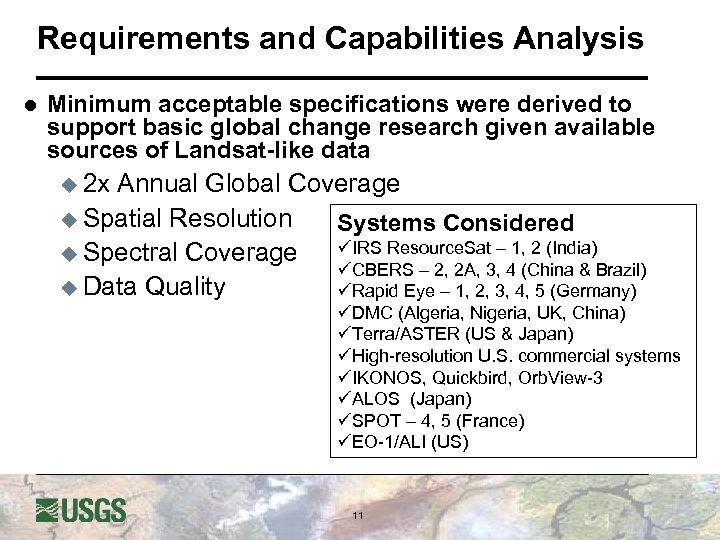 LDCM Launch Date vs. Data Gap l l Projected LDCM launch late 2011 (ambitious schedule) Previous fuel-depletion projection for Landsat 5 and 7 was late 2010 u u u l Atmospheric drag has been less than anticipated Repositioning orbital “burns” have been very efficient Revised fuel-depletion dates may be forthcoming USGS/NASA-led Data Gap Study Team investigating alternatives to at least partially offset potential data gap u u u Technical investigations of data from India’s Resource. Sat and China/Brazil CBERS satellites nearing completion Other systems are also under consideration Request for Information distributed by USGS February 2007; responses are being evaluated 10