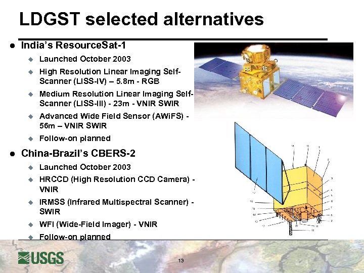 LDGST selected alternatives l India’s Resource. Sat-1 u u High Resolution Linear Imaging Self. Scanner (LISS-IV) – 5. 8 m - RGB u Medium Resolution Linear Imaging Self. Scanner (LISS-III) - 23 m - VNIR SWIR u Advanced Wide Field Sensor (AWi. FS) 56 m – VNIR SWIR u l Launched October 2003 Follow-on planned China-Brazil’s CBERS-2 u Launched October 2003 u HRCCD (High Resolution CCD Camera) VNIR u IRMSS (Infrared Multispectral Scanner) SWIR u WFI (Wide-Field Imager) - VNIR u Follow-on planned 13