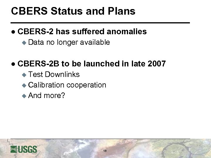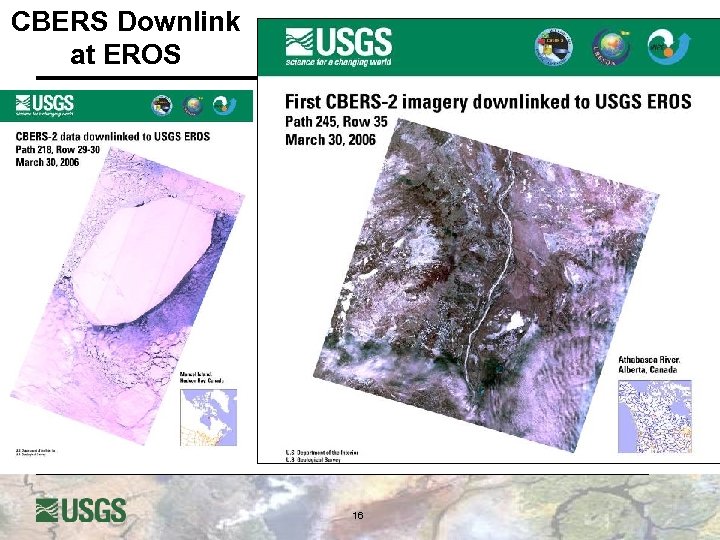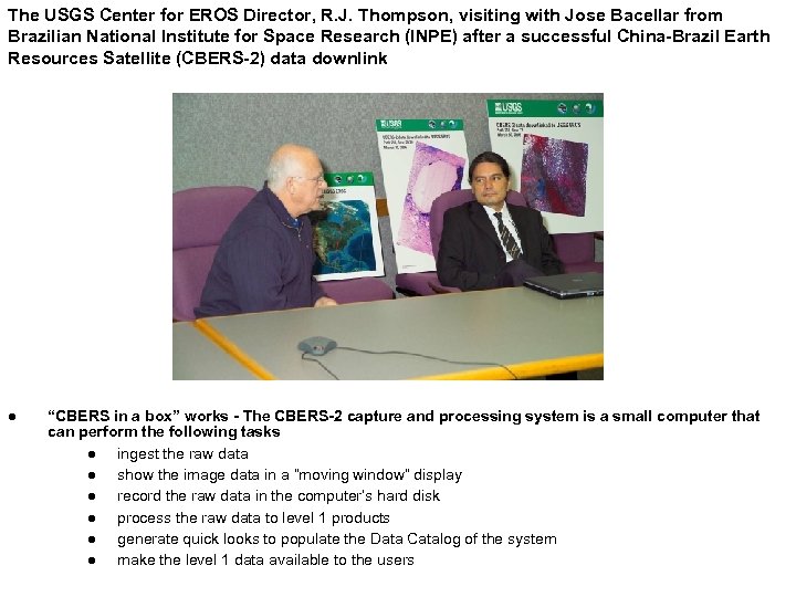 The USGS Center for EROS Director, R. J. Thompson, visiting with Jose Bacellar from Brazilian National Institute for Space Research (INPE) after a successful China-Brazil Earth Resources Satellite (CBERS-2) data downlink l “CBERS in a box” works - The CBERS-2 capture and processing system is a small computer that can perform the following tasks l ingest the raw data l show the image data in a “moving window” display l record the raw data in the computer’s hard disk l process the raw data to level 1 products l generate quick looks to populate the Data Catalog of the system l make the level 1 data available to the users