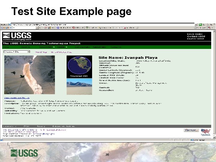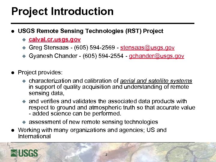 Project Introduction l USGS Remote Sensing Technologies (RST) Project u calval. cr. usgs. gov u Greg Stensaas - (605) 594 -2569 - stensaas@usgs. gov u Gyanesh Chander - (605) 594 -2554 - gchander@usgs. gov l Project provides: u characterization and calibration of aerial and satellite systems in support of quality acquisition and understanding of remote sensing data, u and verifies and validates the associated data products with respect to ground atmospheric truth so that accurate value - added science can be performed. u assessment of new remote sensing technologies Working with many organizations and agencies; US and International l 2