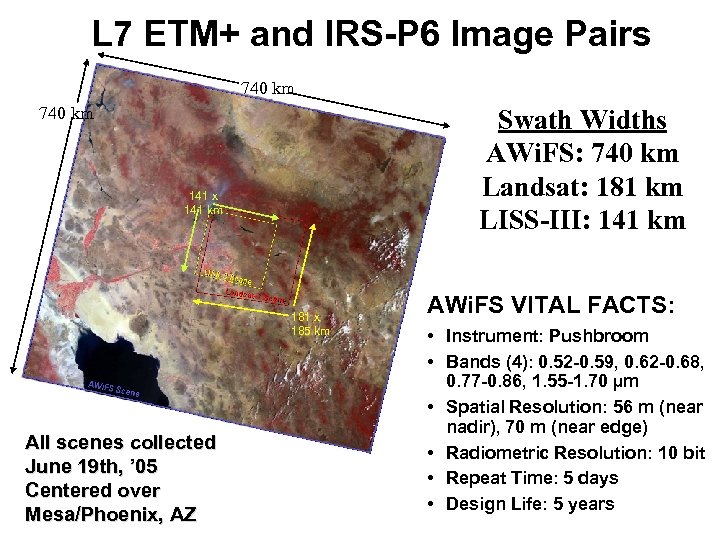 L 7 ETM+ and IRS-P 6 Image Pairs 740 km Swath Widths AWi. FS: 740 km Landsat: 181 km LISS-III: 141 km 141 x 141 km 181 x 185 km All scenes collected June 19 th, ’ 05 Centered over Mesa/Phoenix, AZ AWi. FS VITAL FACTS: • Instrument: Pushbroom • Bands (4): 0. 52 -0. 59, 0. 62 -0. 68, 0. 77 -0. 86, 1. 55 -1. 70 µm • Spatial Resolution: 56 m (near nadir), 70 m (near edge) • Radiometric Resolution: 10 bit • Repeat Time: 5 days • Design Life: 5 years