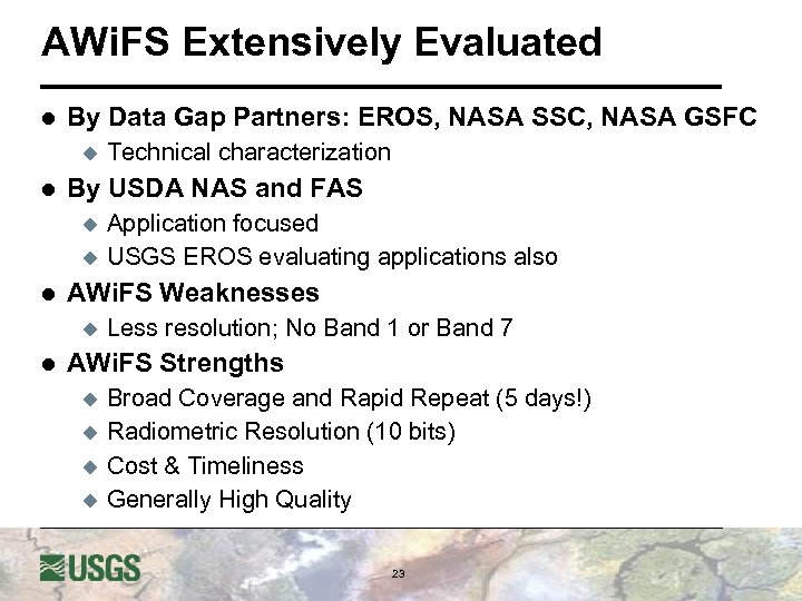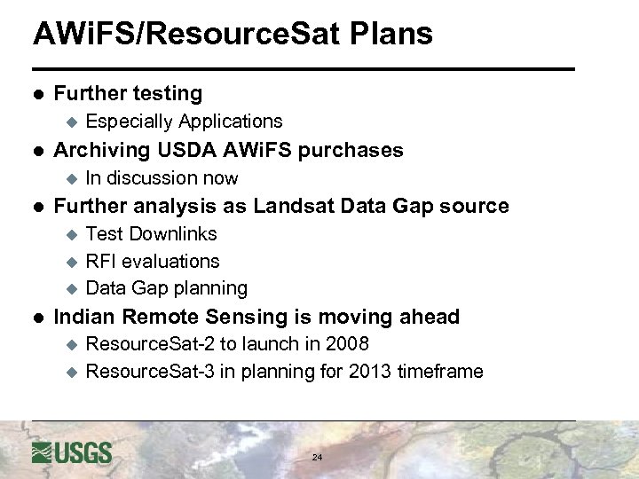 AWi. FS Extensively Evaluated l By Data Gap Partners: EROS, NASA SSC, NASA GSFC u l By USDA NAS and FAS u u l Application focused USGS EROS evaluating applications also AWi. FS Weaknesses u l Technical characterization Less resolution; No Band 1 or Band 7 AWi. FS Strengths u u Broad Coverage and Rapid Repeat (5 days!) Radiometric Resolution (10 bits) Cost & Timeliness Generally High Quality 23