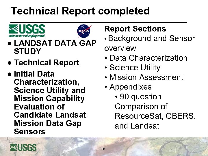 Technical Report completed Report Sections • Background and Sensor l LANDSAT DATA GAP overview STUDY • Data Characterization l Technical Report • Science Utility l Initial Data • Mission Assessment Characterization, • Appendixes Science Utility and • 90 question Mission Capability Comparison of Evaluation of Candidate Landsat Resource. Sat, CBERS, Mission Data Gap and Landsat Sensors 26
