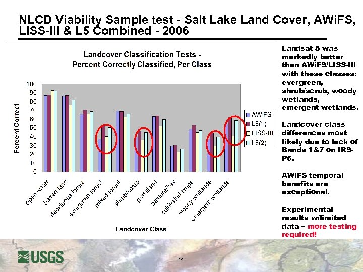 NLCD Viability Sample test - Salt Lake Land Cover, AWi. FS, LISS-III & L 5 Combined - 2006 Landsat 5 was markedly better than AWi. FS/LISS-III with these classes: evergreen, shrub/scrub, woody wetlands, emergent wetlands. Landcover class differences most likely due to lack of Bands 1&7 on IRSP 6. AWi. FS temporal benefits are exceptional. Experimental results w/limited data – more testing required! 27