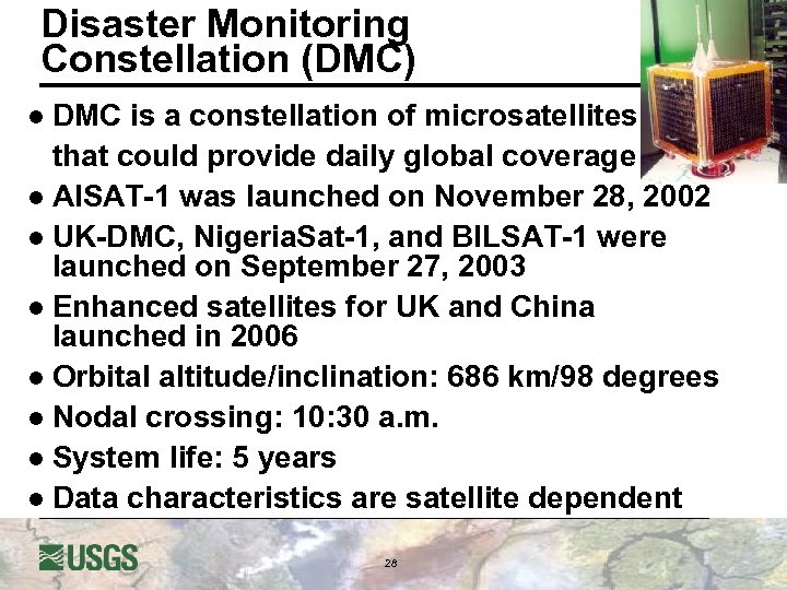 Disaster Monitoring Constellation (DMC) l DMC is a constellation of microsatellites that could provide daily global coverage l Al. SAT-1 was launched on November 28, 2002 l UK-DMC, Nigeria. Sat-1, and BILSAT-1 were launched on September 27, 2003 l Enhanced satellites for UK and China launched in 2006 l Orbital altitude/inclination: 686 km/98 degrees l Nodal crossing: 10: 30 a. m. l System life: 5 years l Data characteristics are satellite dependent 28