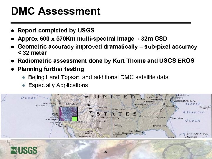 DMC Assessment l l l Report completed by USGS Approx 600 x 570 Km multi-spectral Image - 32 m GSD Geometric accuracy improved dramatically – sub-pixel accuracy < 32 meter Radiometric assessment done by Kurt Thome and USGS EROS Planning further testing u Bejing 1 and Topsat, and additional DMC satellite data u Especially Applications 29