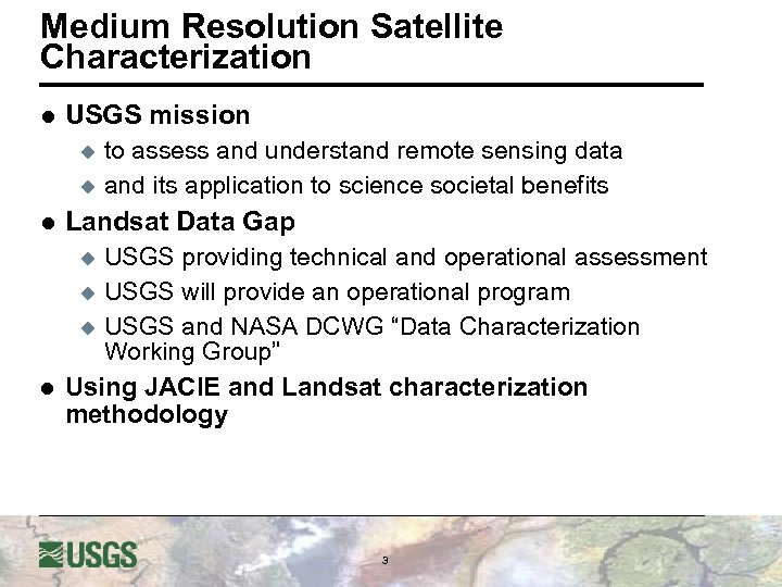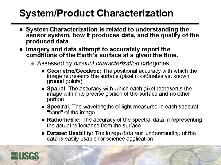 Medium Resolution Satellite Characterization l USGS mission to assess and understand remote sensing data u and its application to science societal benefits u l Landsat Data Gap USGS providing technical and operational assessment u USGS will provide an operational program u USGS and NASA DCWG “Data Characterization Working Group” l Using JACIE and Landsat characterization methodology u 3
