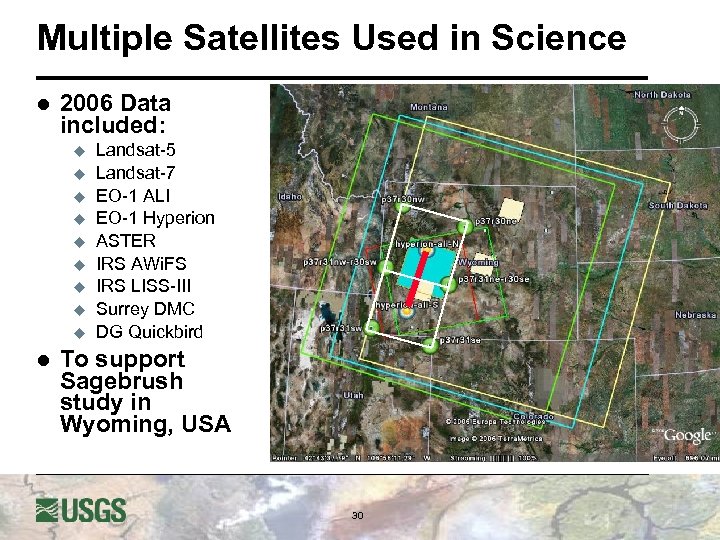 Multiple Satellites Used in Science l 2006 Data included: u u u u u l Landsat-5 Landsat-7 EO-1 ALI EO-1 Hyperion ASTER IRS AWi. FS IRS LISS-III Surrey DMC DG Quickbird To support Sagebrush study in Wyoming, USA 30