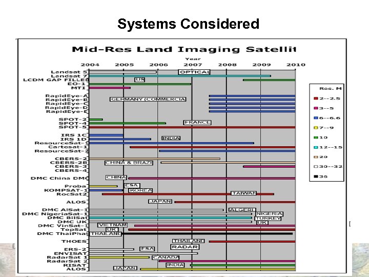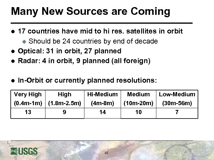 Many New Sources are Coming l 17 countries have mid to hi res. satellites in orbit u Should be 24 countries by end of decade Optical: 31 in orbit, 27 planned Radar: 4 in orbit, 9 planned (all foreign) l In-Orbit or currently planned resolutions: l l Very High Hi-Medium Low-Medium (0. 4 m-1 m) 13 (1. 8 m-2. 5 m) 9 (4 m-8 m) 14 (10 m-20 m) 10 (30 m-56 m) 7 32