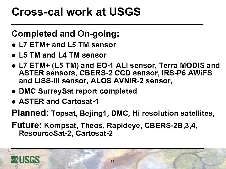 Cross-cal work at USGS Completed and On-going: l l l L 7 ETM+ and L 5 TM sensor L 5 TM and L 4 TM sensor L 7 ETM+ (L 5 TM) and EO-1 ALI sensor, Terra MODIS and ASTER sensors, CBERS-2 CCD sensor, IRS-P 6 AWi. FS and LISS-III sensor, ALOS AVNIR-2 sensor, DMC Surrey. Sat report completed ASTER and Cartosat-1 Planned: Topsat, Bejing 1, DMC, Hi resolution satellites, Future: Kompsat, Theos, Rapideye, CBERS-2 B, 3, 4, Resource. Sat-2, Cartosat-2 33