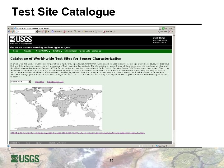 CEOS Calibration-Validation Sites l World-wide Cal/Val Sites for African Desert Sites u u u l l Monitoring various sensors Cross calibration Integrated science applications Site description Surface Measurements FTP access via Cal/Val portals Prime Sites for data collection Supports GEO Tasks ALOS Cal/Val sites 34 Landsat Super sites