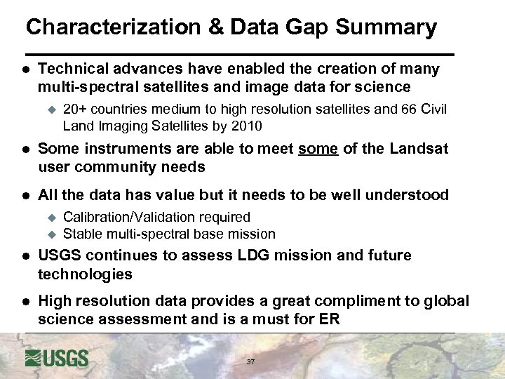 Characterization & Data Gap Summary l Technical advances have enabled the creation of many multi-spectral satellites and image data for science u 20+ countries medium to high resolution satellites and 66 Civil Land Imaging Satellites by 2010 l Some instruments are able to meet some of the Landsat user community needs l All the data has value but it needs to be well understood u u Calibration/Validation required Stable multi-spectral base mission l USGS continues to assess LDG mission and future technologies l High resolution data provides a great compliment to global science assessment and is a must for ER 37
