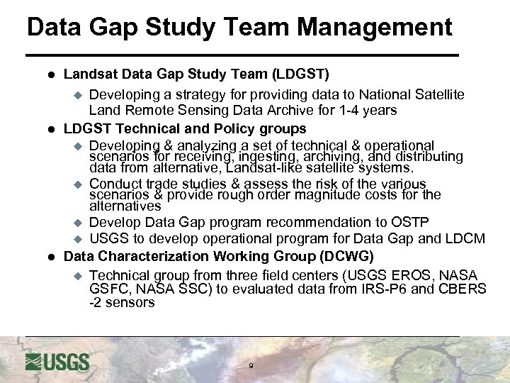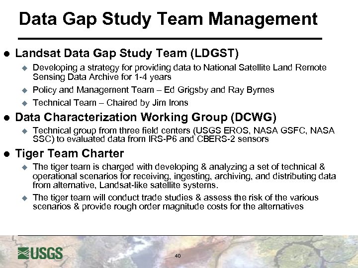 Data Gap Study Team Management l Landsat Data Gap Study Team (LDGST) u u u l Data Characterization Working Group (DCWG) u l Developing a strategy for providing data to National Satellite Land Remote Sensing Data Archive for 1 -4 years Policy and Management Team – Ed Grigsby and Ray Byrnes Technical Team – Chaired by Jim Irons Technical group from three field centers (USGS EROS, NASA GSFC, NASA SSC) to evaluated data from IRS-P 6 and CBERS-2 sensors Tiger Team Charter u u The tiger team is charged with developing & analyzing a set of technical & operational scenarios for receiving, ingesting, archiving, and distributing data from alternative, Landsat-like satellite systems. The tiger team will conduct trade studies & assess the risk of the various scenarios & provide rough order magnitude costs for the alternatives 40