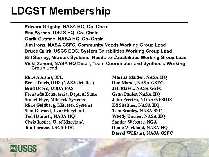 LDGST Membership Edward Grigsby, NASA HQ, Co- Chair Ray Byrnes, USGS HQ, Co- Chair Garik Gutman, NASA HQ, Co- Chair Jim Irons, NASA GSFC, Community Needs Working Group Lead Bruce Quirk, USGS EDC, System Capabilities Working Group Lead Bill Stoney, Mitretek Systems, Needs-to-Capabilities Working Group Lead Vicki Zanoni, NASA HQ Detail, Team Coordinator and Synthesis Working Group Lead Mike Abrams, JPL Bruce Davis, DHS (NASA detailee) Brad Doorn, USDA FAS Fernando Echavarria, Dept. of State Stuart Frye, Mitretek Systems Mike Goldberg, Mitretek Systems Sam Goward, U. of Maryland Ted Hammer, NASA HQ Chris Justice, U. of Maryland Jim Lacasse, USGS EDC Martha Maiden, NASA HQ Dan Mandl, NASA GSFC Jeff Masek, NASA GSFC Gran Paules, NASA HQ John Pereira, NOAA/NESDIS Ed Sheffner, NASA HQ Tom Stanley, NASA SSC Woody Turner, NASA HQ Sandra Webster, NGA Diane Wickland, NASA HQ Darrel Williams, NASA GSFC 41