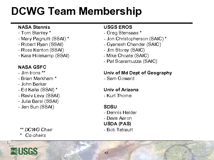 DCWG Team Membership NASA Stennis - Tom Stanley * - Mary Pagnutti (SSAI) * - Robert Ryan (SSAI) - Ross Kenton (SSAI) - Kara Holekamp (SSAI) NASA GSFC - Jim Irons ** - Brian Markham * - John Barker - Ed Kaita (SSAI) * - Raviv Levy (SSAI) - Julia Barsi (SSAI) - Jen Sun (SSAI) ** DCWG Chair * Co-chairs USGS EROS - Greg Stensaas * - Jon Christopherson (SAIC) * - Gyanesh Chander (SAIC) - Jim Storey (SAIC) - Mike Choate (SAIC) - Pat Scaramuzza (SAIC) Univ of Md Dept of Geography - Sam Goward Univ of Arizona - Kurt Thome SDSU - Dennis Helder - Dave Aaron USDA (FAS) - Bob Tetrault 42