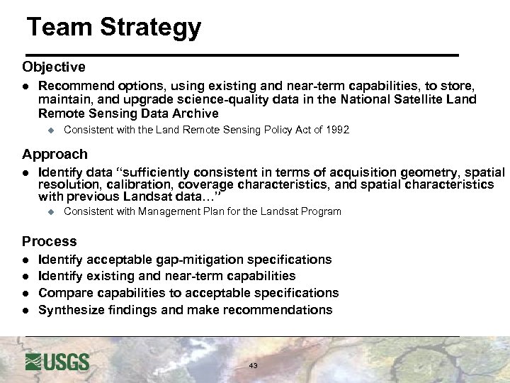 Team Strategy Objective l Recommend options, using existing and near-term capabilities, to store, maintain, and upgrade science-quality data in the National Satellite Land Remote Sensing Data Archive u Consistent with the Land Remote Sensing Policy Act of 1992 Approach l Identify data “sufficiently consistent in terms of acquisition geometry, spatial resolution, calibration, coverage characteristics, and spatial characteristics with previous Landsat data…” u Consistent with Management Plan for the Landsat Program Process l l Identify acceptable gap-mitigation specifications Identify existing and near-term capabilities Compare capabilities to acceptable specifications Synthesize findings and make recommendations 43