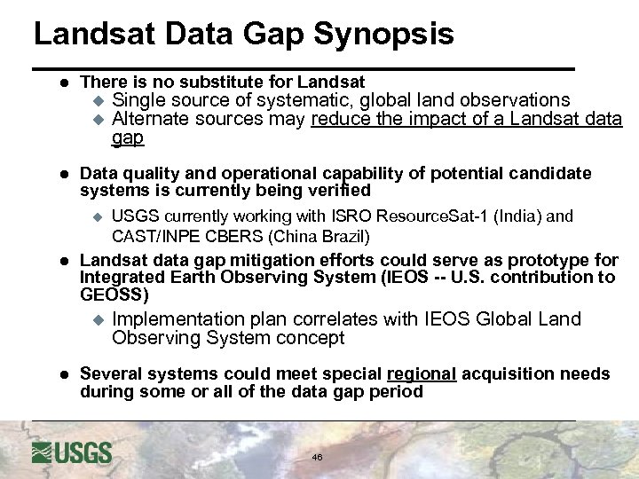 LDGST Summary l There is no substitute for Landsat u u l l Single source of systematic, global land observations Alternate sources may reduce the impact of a Landsat data gap We are characterizing multiple systems to understand which data sets may be compatible with the Landsat data record and can potentially supplement the Landsat data archive, but no decisions have been made yet Landsat Data Gap Study Team will: u u u Finalize recommendations and strategy for implementation Present findings to U. S. civil agency management and the White House Office of Space and Technology Policy Implement recommendations 45