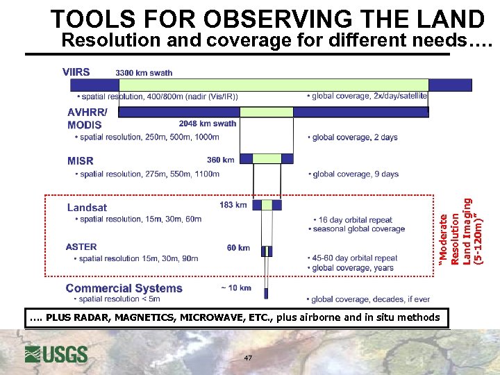 TOOLS FOR OBSERVING THE LAND “Moderate Resolution Land Imaging (5 -120 m)” Resolution and coverage for different needs…. …. PLUS RADAR, MAGNETICS, MICROWAVE, ETC. , plus airborne and in situ methods 47