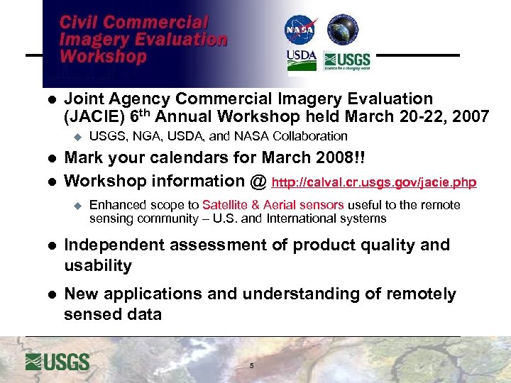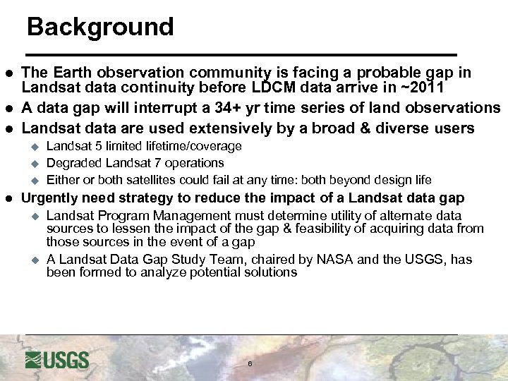 l Joint Agency Commercial Imagery Evaluation (JACIE) 6 th Annual Workshop held March 20 -22, 2007 u l l USGS, NGA, USDA, and NASA Collaboration Mark your calendars for March 2008!! Workshop information @ http: //calval. cr. usgs. gov/jacie. php u Enhanced scope to Satellite & Aerial sensors useful to the remote sensing community – U. S. and International systems l Independent assessment of product quality and usability l New applications and understanding of remotely sensed data 5