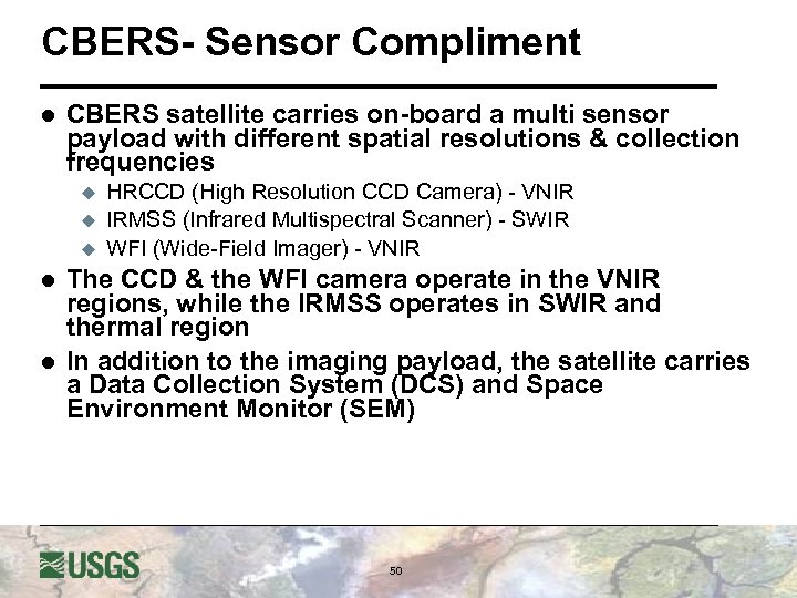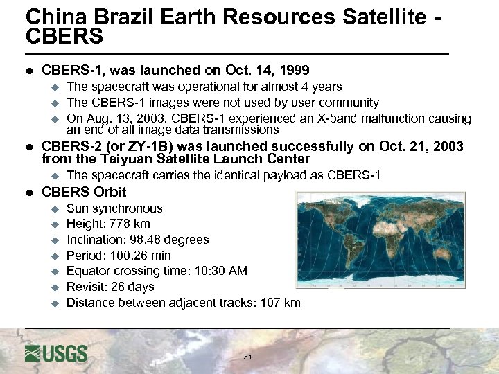 CBERS- Sensor Compliment l CBERS satellite carries on-board a multi sensor payload with different spatial resolutions & collection frequencies u u u l l HRCCD (High Resolution CCD Camera) - VNIR IRMSS (Infrared Multispectral Scanner) - SWIR WFI (Wide-Field Imager) - VNIR The CCD & the WFI camera operate in the VNIR regions, while the IRMSS operates in SWIR and thermal region In addition to the imaging payload, the satellite carries a Data Collection System (DCS) and Space Environment Monitor (SEM) 50