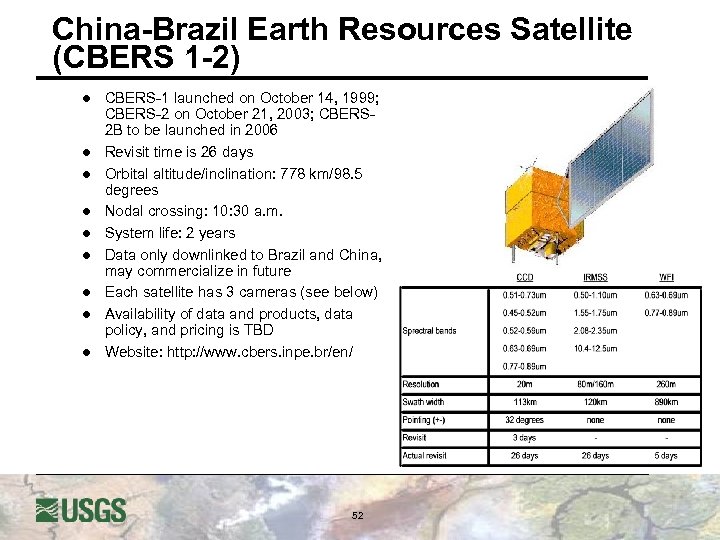 China Brazil Earth Resources Satellite CBERS l CBERS-1, was launched on Oct. 14, 1999 u u u l CBERS-2 (or ZY-1 B) was launched successfully on Oct. 21, 2003 from the Taiyuan Satellite Launch Center u l The spacecraft was operational for almost 4 years The CBERS-1 images were not used by user community On Aug. 13, 2003, CBERS-1 experienced an X-band malfunction causing an end of all image data transmissions The spacecraft carries the identical payload as CBERS-1 CBERS Orbit u u u u Sun synchronous Height: 778 km Inclination: 98. 48 degrees Period: 100. 26 min Equator crossing time: 10: 30 AM Revisit: 26 days Distance between adjacent tracks: 107 km 51