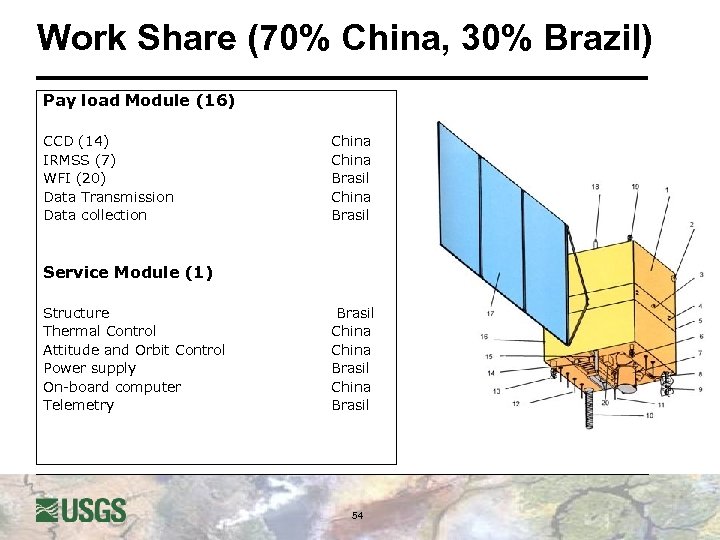Work Share (70% China, 30% Brazil) Pay load Module (16) CCD (14) IRMSS (7) WFI (20) Data Transmission Data collection China Brasil Service Module (1) Structure Thermal Control Attitude and Orbit Control Power supply On-board computer Telemetry Brasil China Brasil 54