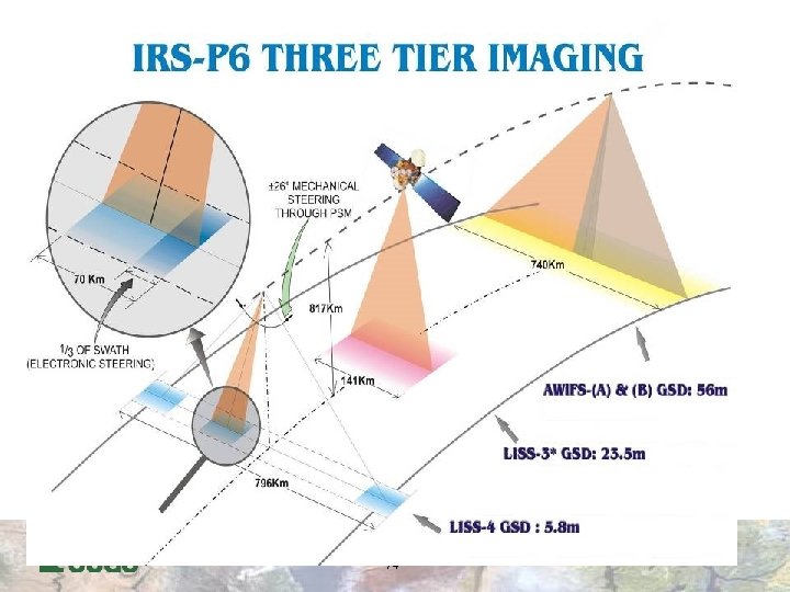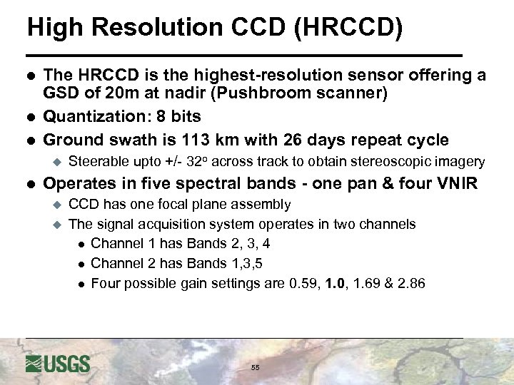 High Resolution CCD (HRCCD) l l l The HRCCD is the highest-resolution sensor offering a GSD of 20 m at nadir (Pushbroom scanner) Quantization: 8 bits Ground swath is 113 km with 26 days repeat cycle u l Steerable upto +/- 32 o across track to obtain stereoscopic imagery Operates in five spectral bands - one pan & four VNIR u u CCD has one focal plane assembly The signal acquisition system operates in two channels l Channel 1 has Bands 2, 3, 4 l Channel 2 has Bands 1, 3, 5 l Four possible gain settings are 0. 59, 1. 0, 1. 69 & 2. 86 55