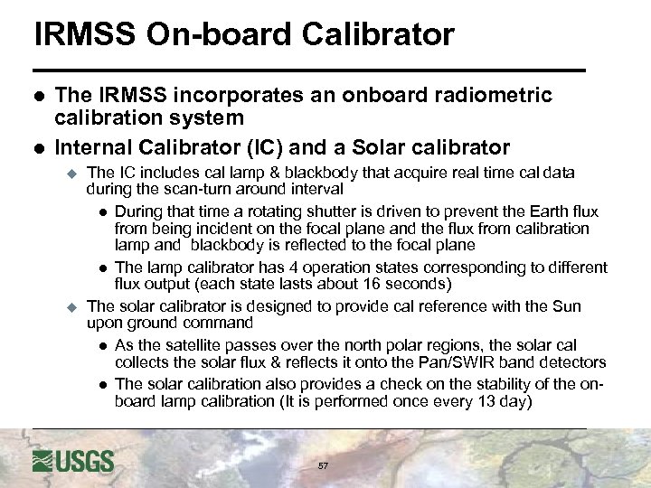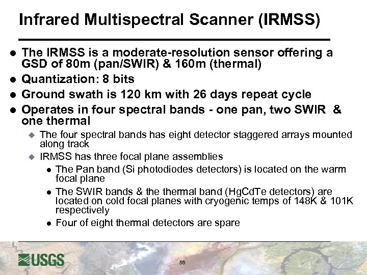 Infrared Multispectral Scanner (IRMSS) l l The IRMSS is a moderate-resolution sensor offering a GSD of 80 m (pan/SWIR) & 160 m (thermal) Quantization: 8 bits Ground swath is 120 km with 26 days repeat cycle Operates in four spectral bands - one pan, two SWIR & one thermal u u The four spectral bands has eight detector staggered arrays mounted along track IRMSS has three focal plane assemblies l The Pan band (Si photodiodes detectors) is located on the warm focal plane l The SWIR bands & thermal band (Hg. Cd. Te detectors) are located on cold focal planes with cryogenic temps of 148 K & 101 K respectively l Four of eight thermal detectors are spare 56