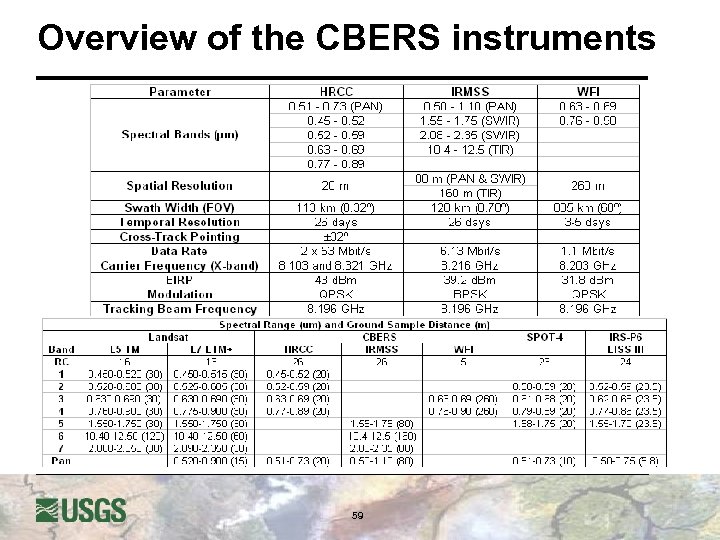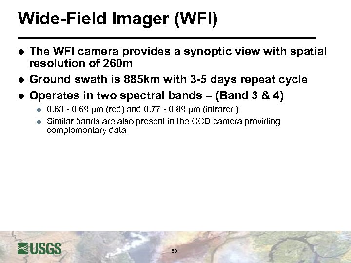 Wide-Field Imager (WFI) l l l The WFI camera provides a synoptic view with spatial resolution of 260 m Ground swath is 885 km with 3 -5 days repeat cycle Operates in two spectral bands – (Band 3 & 4) u u 0. 63 - 0. 69 μm (red) and 0. 77 - 0. 89 μm (infrared) Similar bands are also present in the CCD camera providing complementary data 58