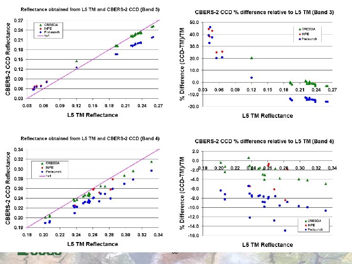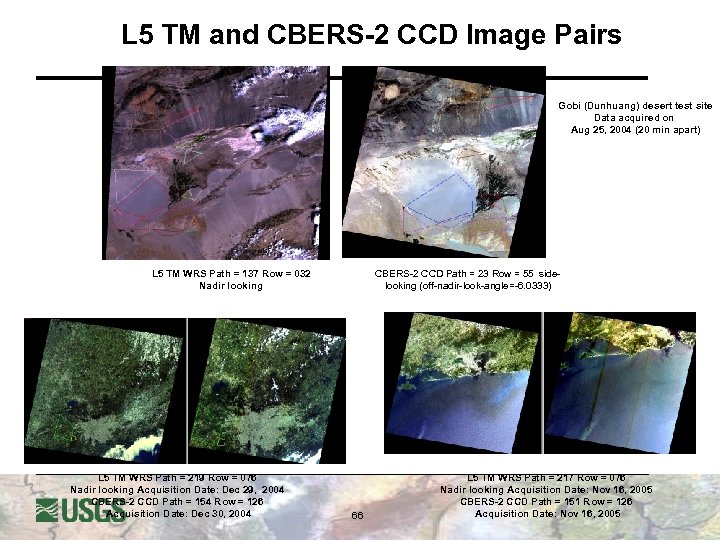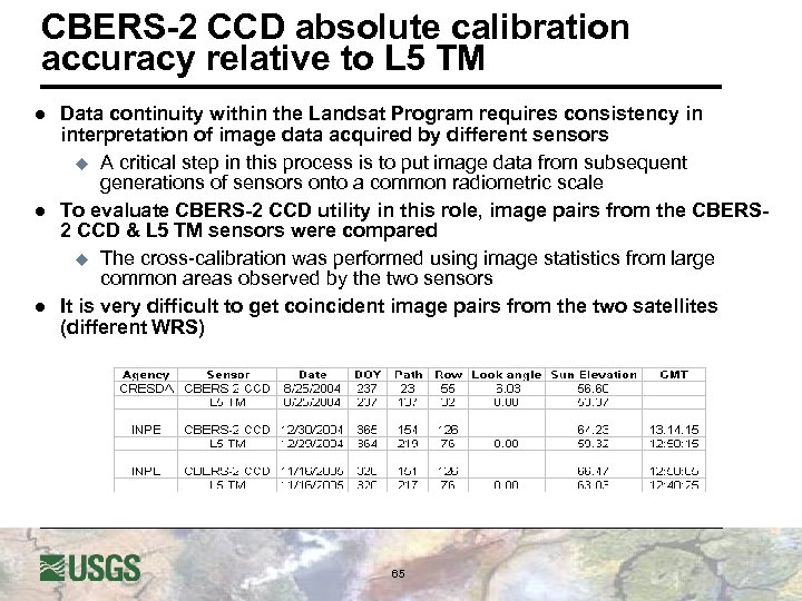 CBERS-2 CCD absolute calibration accuracy relative to L 5 TM l l l Data continuity within the Landsat Program requires consistency in interpretation of image data acquired by different sensors u A critical step in this process is to put image data from subsequent generations of sensors onto a common radiometric scale To evaluate CBERS-2 CCD utility in this role, image pairs from the CBERS 2 CCD & L 5 TM sensors were compared u The cross-calibration was performed using image statistics from large common areas observed by the two sensors It is very difficult to get coincident image pairs from the two satellites (different WRS) 65