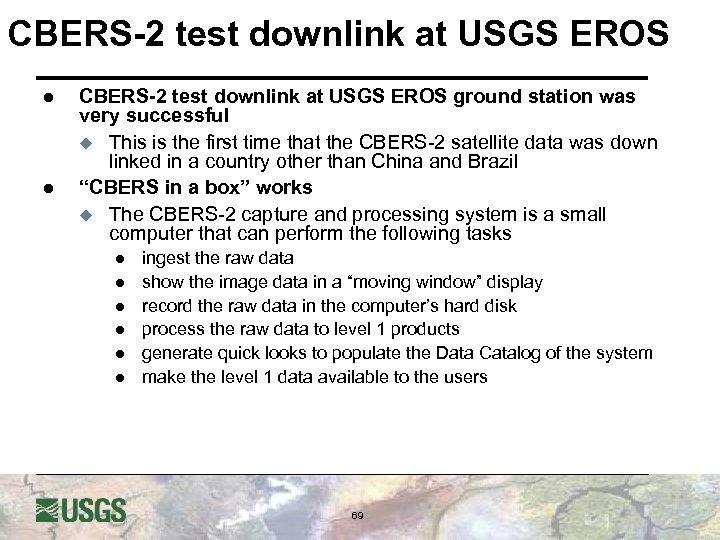 CBERS-2 test downlink at USGS EROS l l CBERS-2 test downlink at USGS EROS ground station was very successful u This is the first time that the CBERS-2 satellite data was down linked in a country other than China and Brazil “CBERS in a box” works u The CBERS-2 capture and processing system is a small computer that can perform the following tasks l l l ingest the raw data show the image data in a “moving window” display record the raw data in the computer’s hard disk process the raw data to level 1 products generate quick looks to populate the Data Catalog of the system make the level 1 data available to the users 69