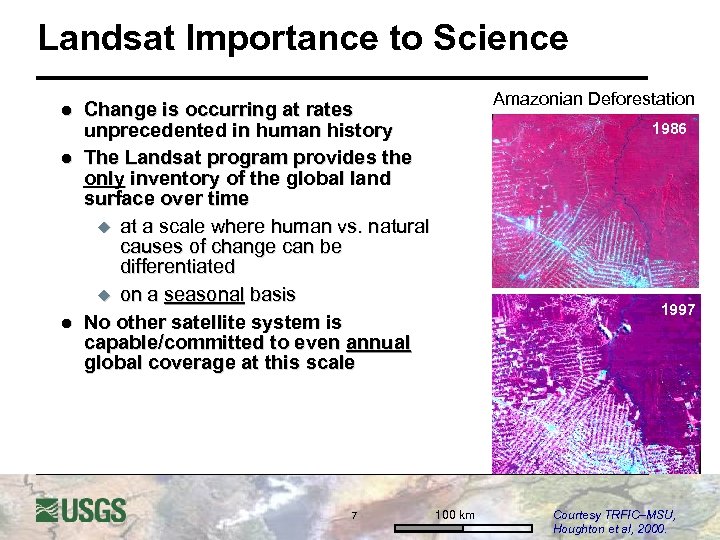 Landsat Importance to Science l l l Amazonian Deforestation Change is occurring at rates unprecedented in human history The Landsat program provides the only inventory of the global land surface over time u at a scale where human vs. natural causes of change can be differentiated u on a seasonal basis No other satellite system is capable/committed to even annual global coverage at this scale 7 1986 1997 100 km Courtesy TRFIC–MSU, Houghton et al, 2000.