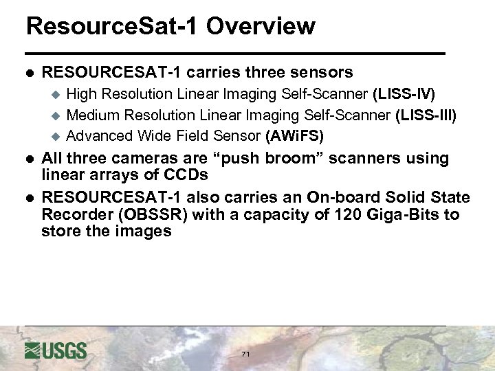 Resource. Sat-1 Overview l RESOURCESAT-1 carries three sensors u u u l l High Resolution Linear Imaging Self-Scanner (LISS-IV) Medium Resolution Linear Imaging Self-Scanner (LISS-III) Advanced Wide Field Sensor (AWi. FS) All three cameras are “push broom” scanners using linear arrays of CCDs RESOURCESAT-1 also carries an On-board Solid State Recorder (OBSSR) with a capacity of 120 Giga-Bits to store the images 71