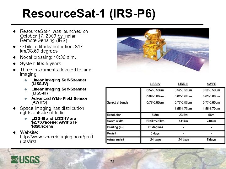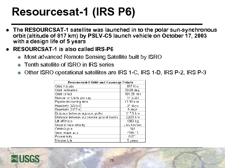 Resource. Sat-1 (IRS-P 6) l l l Resource. Sat-1 was launched on October 17, 2003 by Indian Remote Sensing (IRS) Orbital altitude/inclination: 817 km/98. 69 degrees Nodal crossing: 10: 30 a. m. System life: 5 years Three instruments devoted to land imaging u u u l Space Imaging has distribution rights outside of India u l Linear Imaging Self-Scanner (LISS-IV) Linear Imaging Self-Scanner (LISS-III) Advanced Wide Field Sensor (AWi. FS) LISS-III and LISS-IV are $2, 750/scene; AWi. FS is $850/scene Website: http: //www. spaceimaging. com/prod ucts/irs/ 72