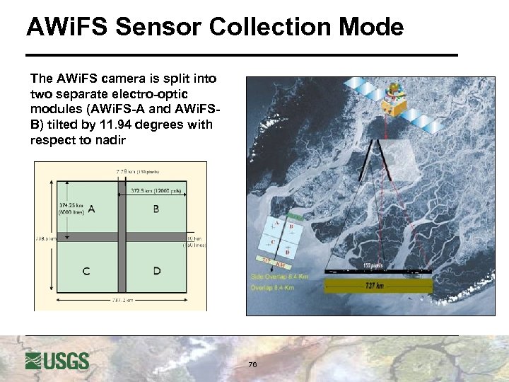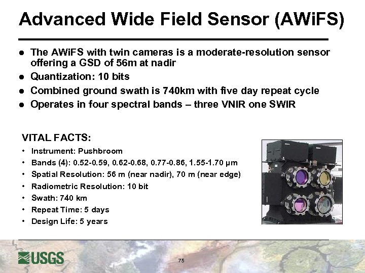 Advanced Wide Field Sensor (AWi. FS) l l The AWi. FS with twin cameras is a moderate-resolution sensor offering a GSD of 56 m at nadir Quantization: 10 bits Combined ground swath is 740 km with five day repeat cycle Operates in four spectral bands – three VNIR one SWIR VITAL FACTS: • • Instrument: Pushbroom Bands (4): 0. 52 -0. 59, 0. 62 -0. 68, 0. 77 -0. 86, 1. 55 -1. 70 µm Spatial Resolution: 56 m (near nadir), 70 m (near edge) Radiometric Resolution: 10 bit Swath: 740 km Repeat Time: 5 days Design Life: 5 years 75
