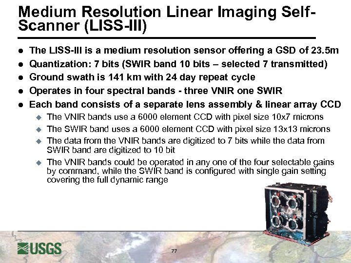 Medium Resolution Linear Imaging Self. Scanner (LISS-III) l l l The LISS-III is a medium resolution sensor offering a GSD of 23. 5 m Quantization: 7 bits (SWIR band 10 bits – selected 7 transmitted) Ground swath is 141 km with 24 day repeat cycle Operates in four spectral bands - three VNIR one SWIR Each band consists of a separate lens assembly & linear array CCD u u The VNIR bands use a 6000 element CCD with pixel size 10 x 7 microns The SWIR band uses a 6000 element CCD with pixel size 13 x 13 microns The data from the VNIR bands are digitized to 7 bits while the data from SWIR band are digitized to 10 bit The VNIR bands could be operated in any one of the four selectable gains by command, while the SWIR band is configured with single gain setting covering the full dynamic range 77