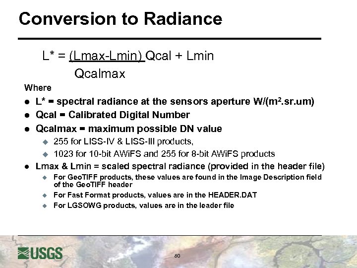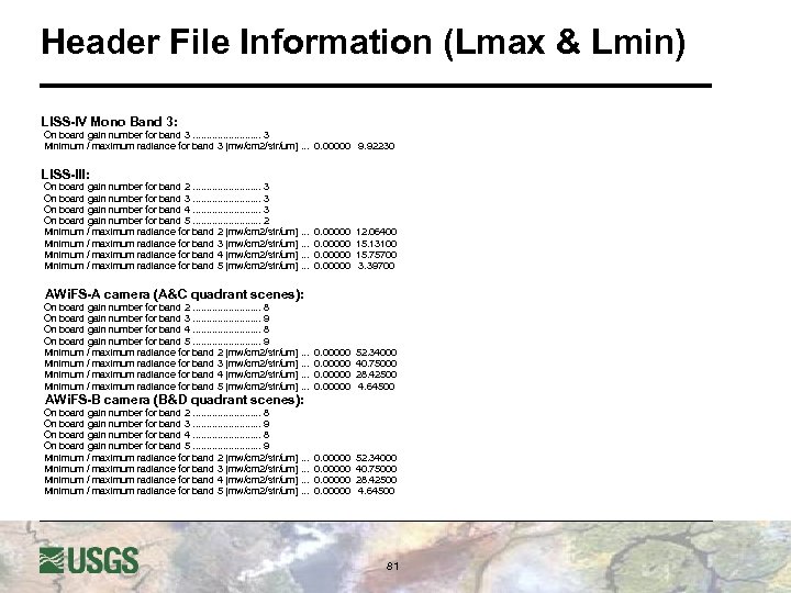Conversion to Radiance L* = (Lmax-Lmin) Qcal + Lmin Qcalmax Where l L* = spectral radiance at the sensors aperture W/(m 2. sr. um) Qcal = Calibrated Digital Number Qcalmax = maximum possible DN value l 255 for LISS-IV & LISS-III products, u 1023 for 10 -bit AWi. FS and 255 for 8 -bit AWi. FS products Lmax & Lmin = scaled spectral radiance (provided in the header file) l l u u For Geo. TIFF products, these values are found in the Image Description field of the Geo. TIFF header For Fast Format products, values are in the HEADER. DAT For LGSOWG products, values are in the leader file 80