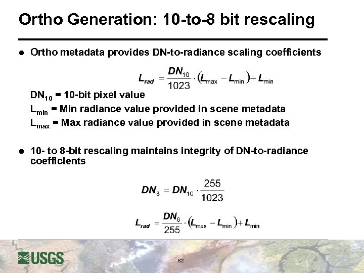 Ortho Generation: 10 -to-8 bit rescaling l Ortho metadata provides DN-to-radiance scaling coefficients DN 10 = 10 -bit pixel value Lmin = Min radiance value provided in scene metadata Lmax = Max radiance value provided in scene metadata l 10 - to 8 -bit rescaling maintains integrity of DN-to-radiance coefficients 82